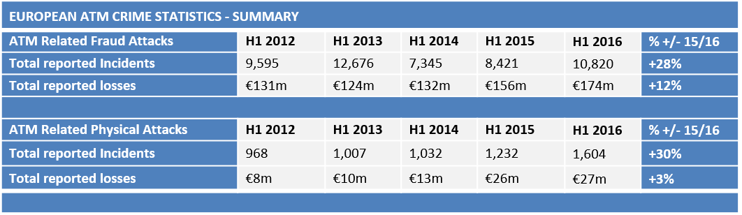 Vediamo ora alcuni interessanti dati statistici europei, nella tabella seguente vengono messi a confronto le percentuali di crescita sia degli attacchi fraudolenti (tipo cash trapping) che degli attacchi fisici (esplosione tramite gas o esplosivi solidi) questi dati in particolare ci vengono forniti dalla European ATM Security Team (EAST - un'organizzazione 'no profit' il cui scopo è raccogliere questo tipo di informazioni